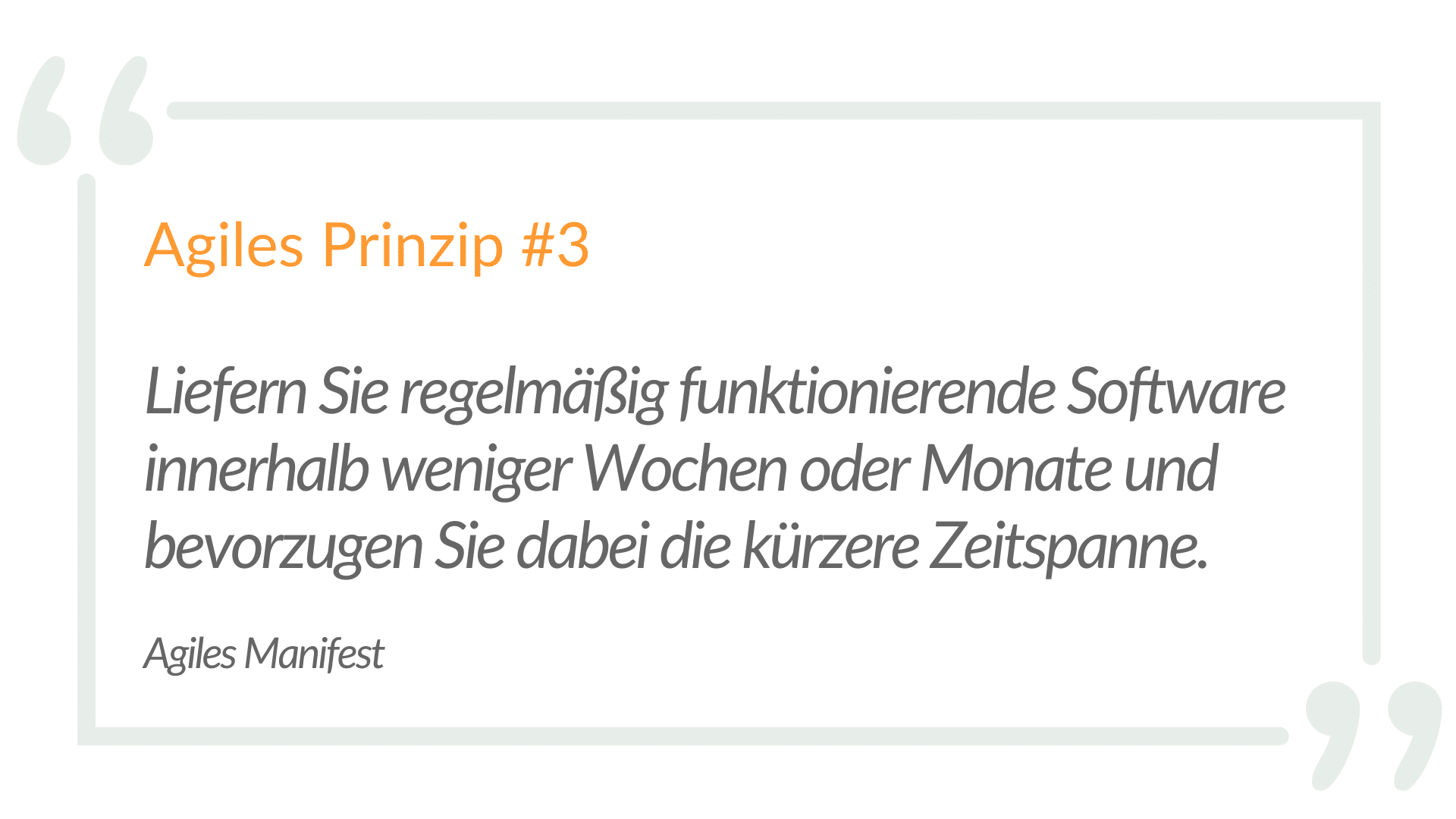 Moment – hatten wir das mit der Regelmäßigkeit nicht schon beim 1. Agilen Prinzip? Die beiden Prinzipien klingen ähnlich, aber achten Sie auf die Kernaussage: Während es beim 1. Agilen Prinzip darum geht, Kund:innen durch regelmäßige Zwischenergebnisse zufriedenzustellen, betont das 3. Agile Prinzip die kurzen Intervalle zwischen diesen (Zwischen)Ergebnissen. Es geht um die Taktung.