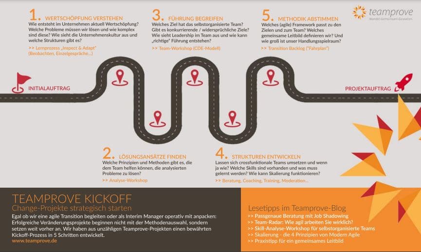 Eine der häufigsten Fragen in Erstgesprächen lautet: „Wie geht es denn jetzt weiter?“ Jedes Projekt ist individuell, aber der Rahmen unseres Kickoff-Workflows hat sich in zahlreichen Interim-Management-Projekten, Skalierungsprozessen und agilen Transformationen als Orientierung und Leitplanken bewährt. Eine strategische Roadmap für einen gelungenen Projektstart – und zwar VOR der Auswahl einer Methode oder der Ausarbeitung eines konkreten Angebotspakets. Diese Kickoff-Roadmap haben wir jetzt in einer Infografik visualisiert.
