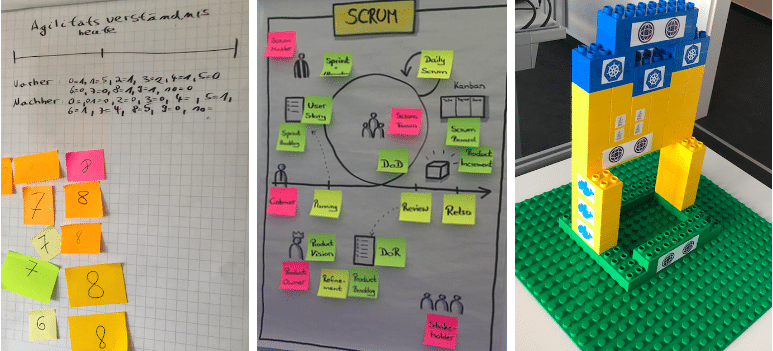 Es reicht nicht aus, Agilität nur theoretisch zu verstehen. Ziel unserer Trainings ist es deshalb, „Aha-Erlebnisse“ zu gestalten und Agilität erlebbar zu machen. Gemeinsam mit der Personalabteilung haben wir beispielsweise im erwähnten Workshop ein individuelles Konzept mit Aktiv-Phasen erarbeitet, in denen die Teilnehmer Scrum, Kanban und Design Thinking spielerisch kennenlernen konnten. Die Bereitschaft des Teams, sich auf Agilität einzulassen, war groß und die Resonanz sehr positiv. Aus den zahlreichen Fragen nach der Anwendbarkeit im Alltag der jeweiligen Abteilungen ergaben sich bereits wertvolle Impulse für die weitere Transformationsstrategie. Nach der subjektiven Einschätzung der Teilnehmer konnte das Verständnis von Agilität durch den Workshop von durchschnittlich 3 auf 7 gesteigert werden (auf einer Skala von 0 bis 10).