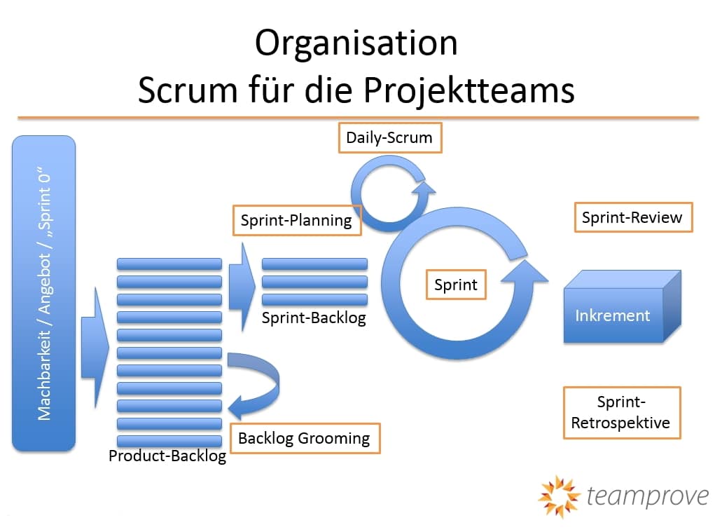 Wichtig für den Projekterfolg ist das Zusammenspiel der Rollen, Ereignisse und Artefakte nach Scrum-Regeln. Dazu betrachten wir den Scrum-Flow genauer: