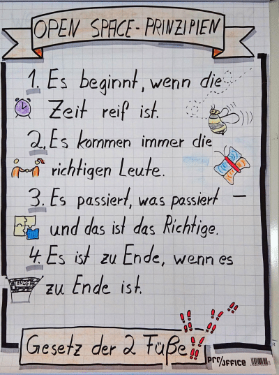 Es gilt das „Gesetz der zwei Füße“: Open Space ist Ausdruck von Freiheit und Selbstverantwortung. Die Teilnehmer*innen bleiben nur solange bei einer Gruppe, wie sie das Gefühl haben, dass sie dort etwas beitragen oder mitnehmen können. Jede*r kann zu jeder Zeit seine Session verlassen und sich eine neue Session suchen. Der Wechsel zwischen den Gruppen ist erlaubt bzw. sogar erwünscht.